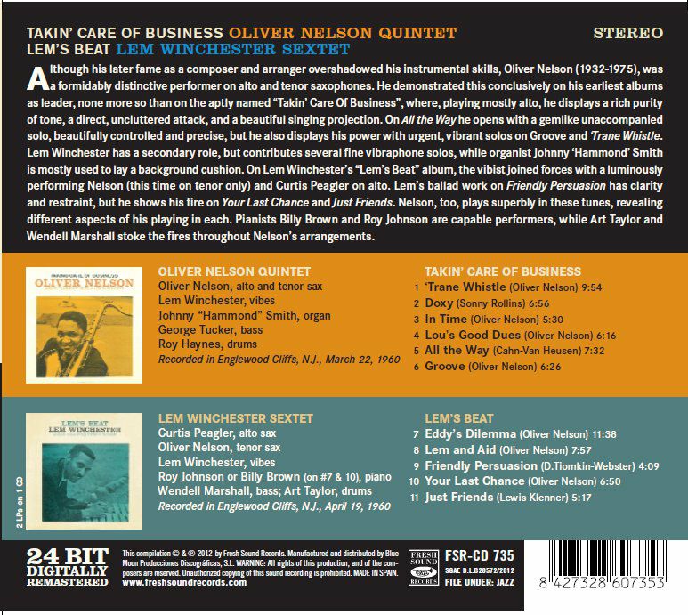 Recorded in Englewood Cliffs, N.J., March 22, 1960 / Recorded in Englewood Cliffs, N.J., April 19, 1960. 24 bit Digitally Remastered Stereo Recording. Sources: (1)-(6): Oliver Nelson album 'Takin' Care Of Business',Prestige/New Jazz 8233 / (7)-(11): Lem Winchester album 'Lem's Beat', Prestige/New Jazz 823